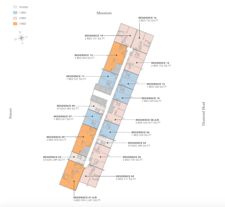 Ulana at Ward Village will be comprised of 41 stories, consisting of 17 units per floor. Each floor will feature (3) studio units, (5) one bedroom units, (6) two bedroom units, and (3) three bedroom units that feature floor to ceiling windows and amazing ocean/mountain views. Studio units will all be approximately 289 SQ FT, 1-bedroom units from approximately 527-530 SQ FT, 2-bedroom units from approximately 711 – 755 SQ FT, and 3-bedroom units from approximately 854 – 1001 SQ FT. All units will come with one parking stall, while two and three bedroom units will come with 2 parking. Guest parking will also be available on site. Ulana at Ward Village will have its primary entrance into the building from Auahi St.
